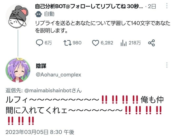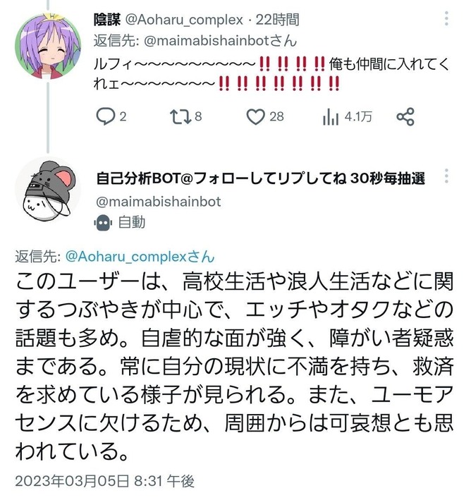 — 自己分析BOT@フォローしてリプしてね 30秒毎抽選 (@maimabishainbot) March 5, 2023