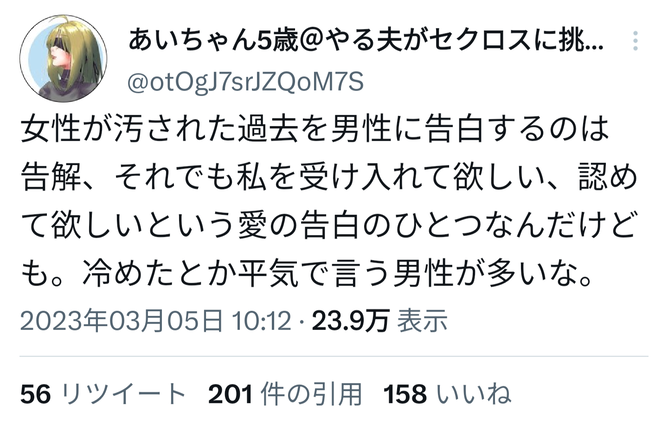 女性が汚された過去を男性に告白するのは告解、それでも私を受け入れて欲しい、認めて欲しいという愛の告白のひとつなんだけども。冷めたとか平気で言う男性が多いな。