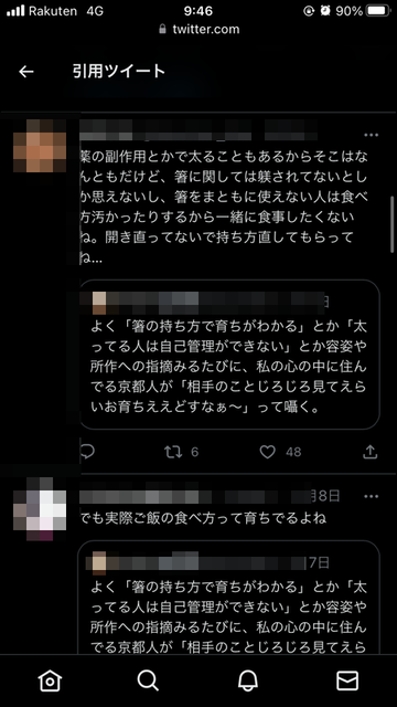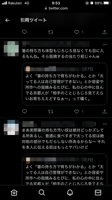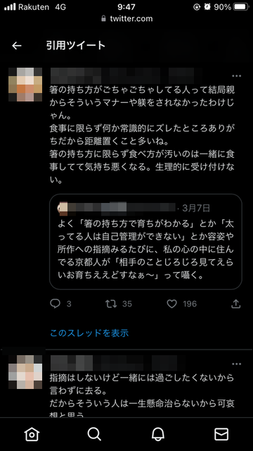 よく「箸の持ち方で育ちがわかる」とか「太ってる人は自己管理ができない」とか容姿や所作への指摘みるたびに、私の心の中に住んでる京都人が「相手のことじろじろ見てえらいお育ちええどすなぁ~」って囁く。