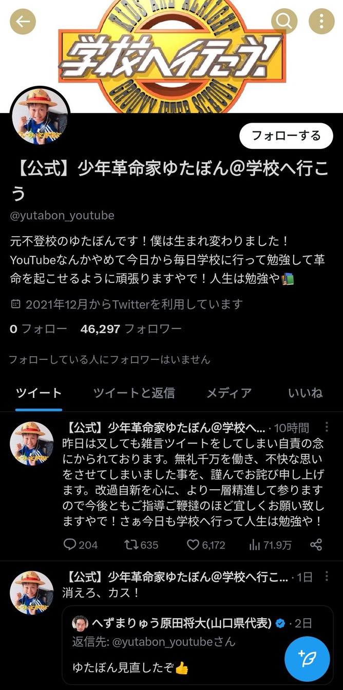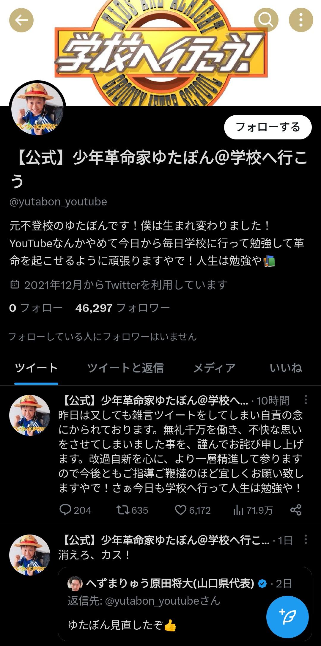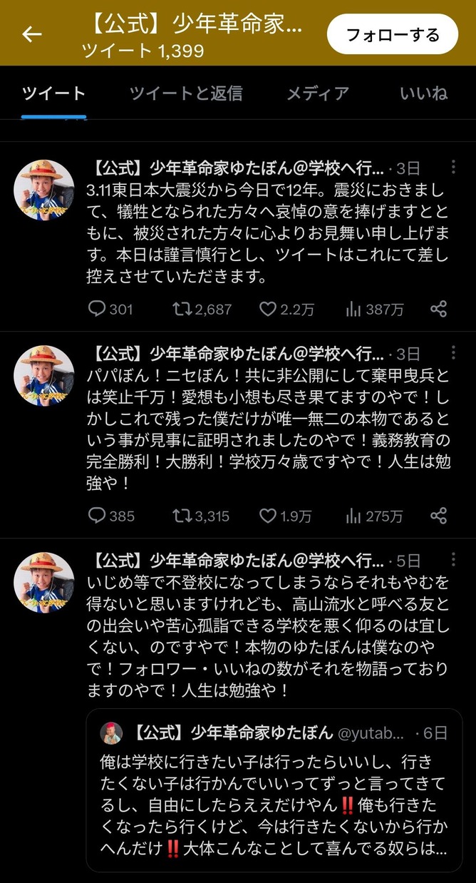 — 【公式】少年革命家ゆたぼん@学校へ行こう (@yutabon_youtube) March 13, 2023