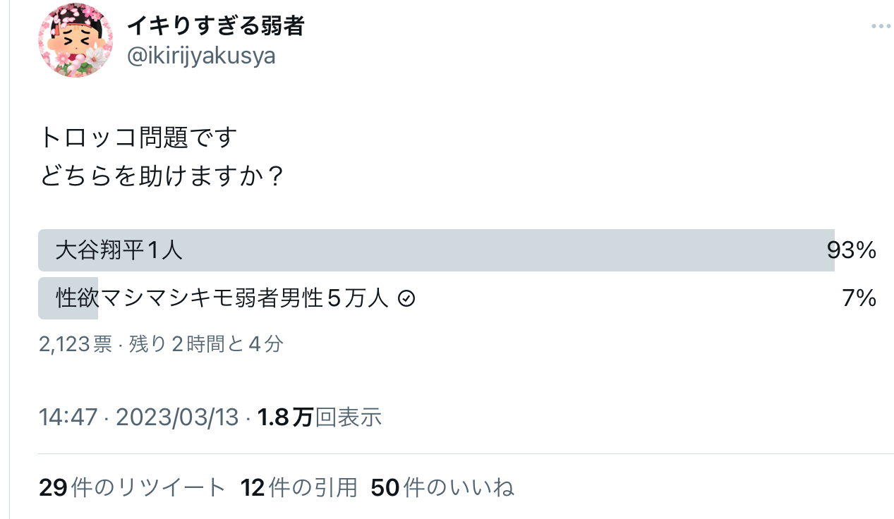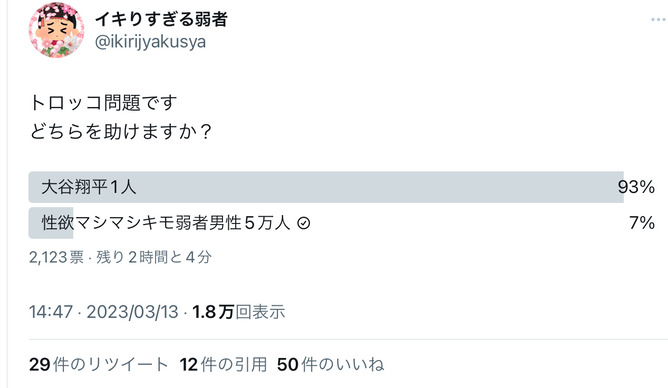 トロッコ問題「大谷翔平と弱者男性5万人、どちらを助けますか?」→結果wwwwwww