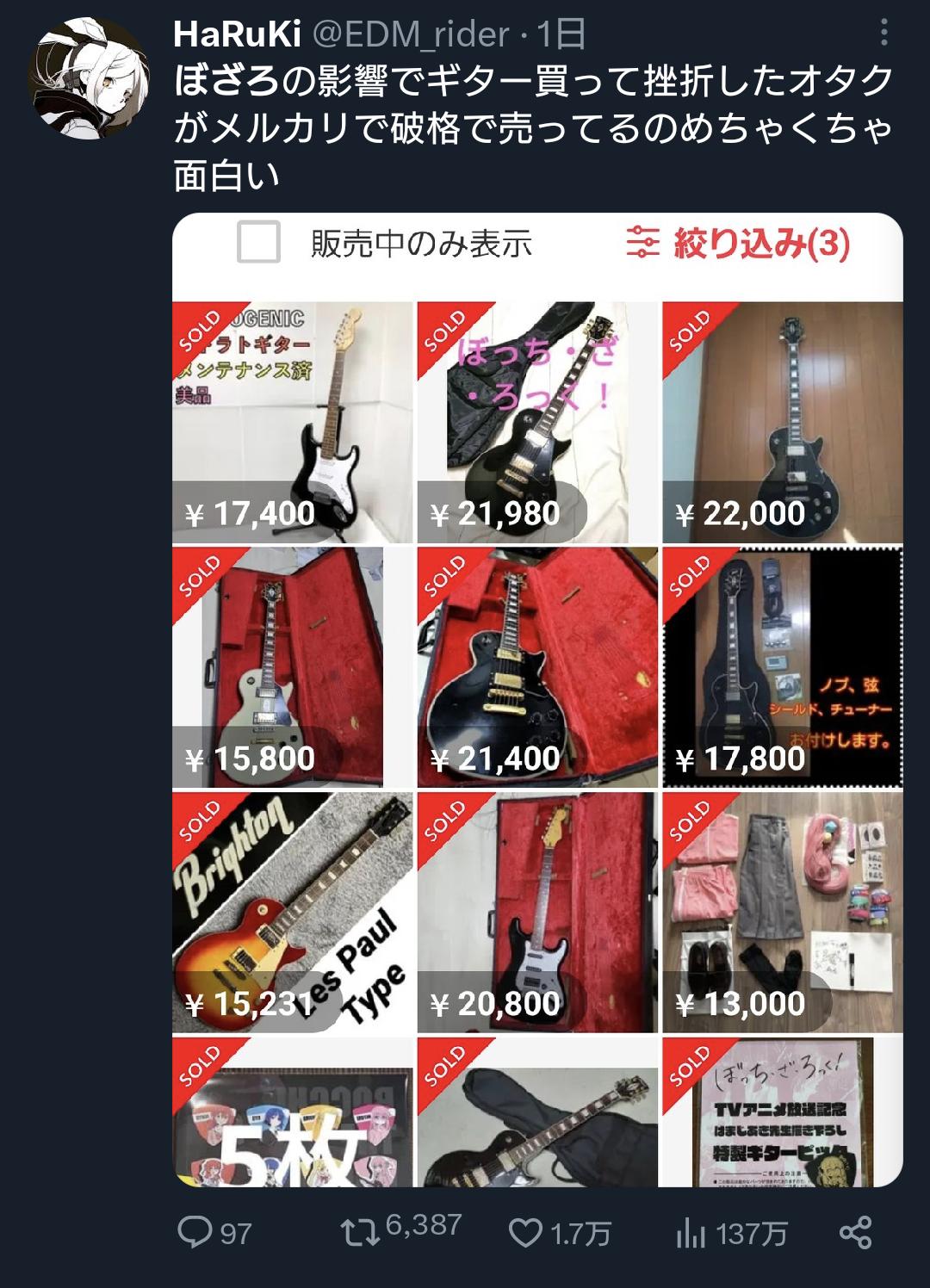 【悲報】Twitter民「ぼざろの影響でギター買ったオタクが挫折して投げ売りしてるww」←2万いいね 2023/3/16 哲学ニュースnwk 1: 風吹けば名無し 2023/03/16(木) 00:04:43.33 ID:kNew/ZP50 死体を沈めるバイトをすることになりました 続きを読む Source: 哲学ニュースnwk