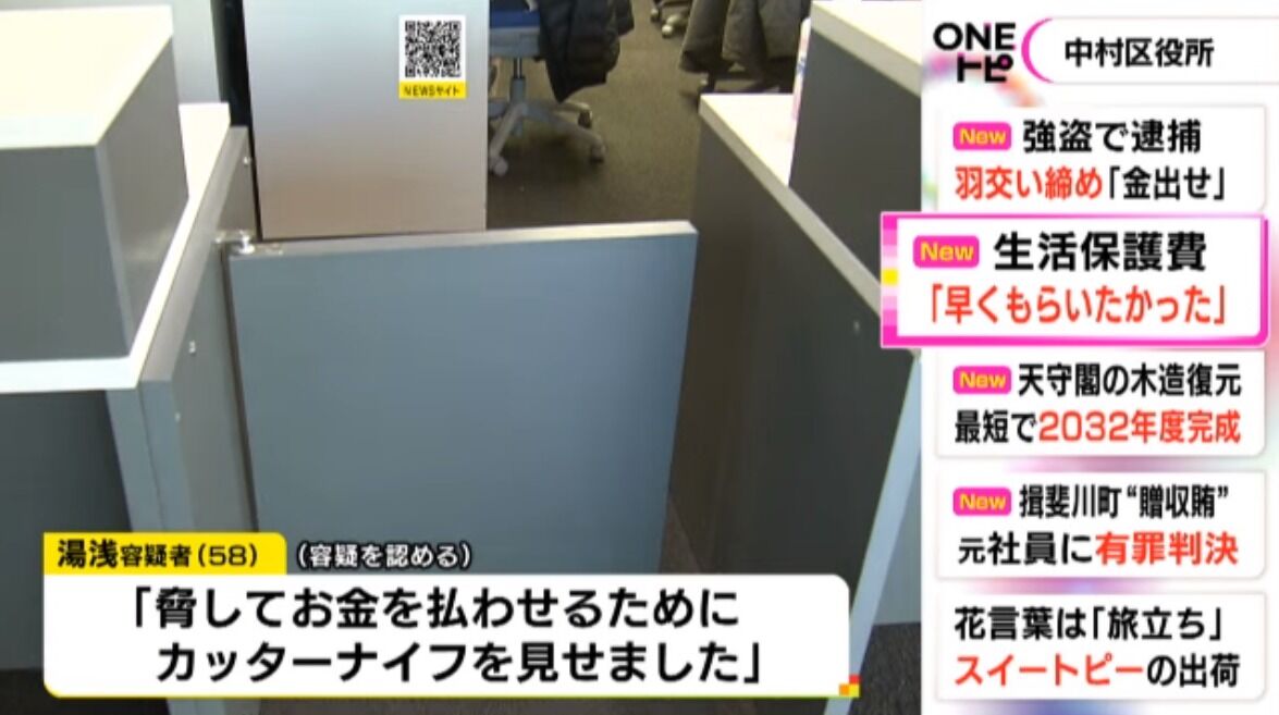 15日午前、名古屋市の中村区役所で、カッターナイフで職員を脅し、金を要求したとして、58歳の無職の男が逮捕されました。