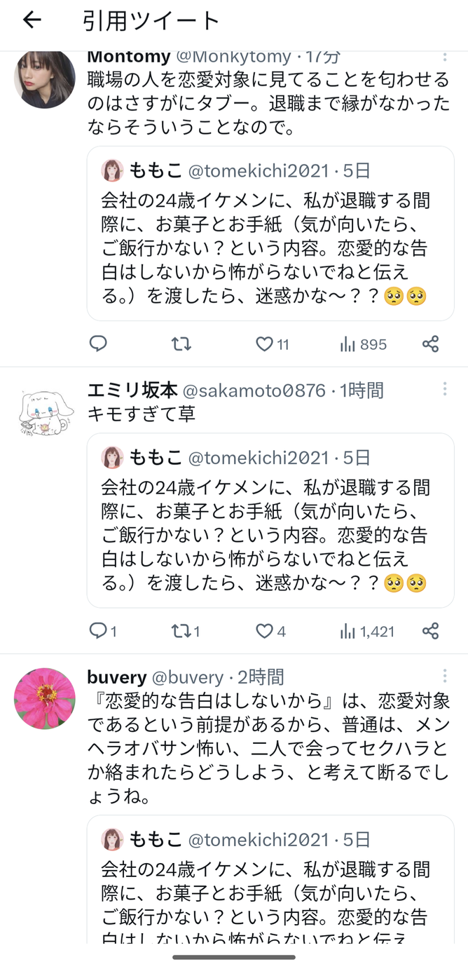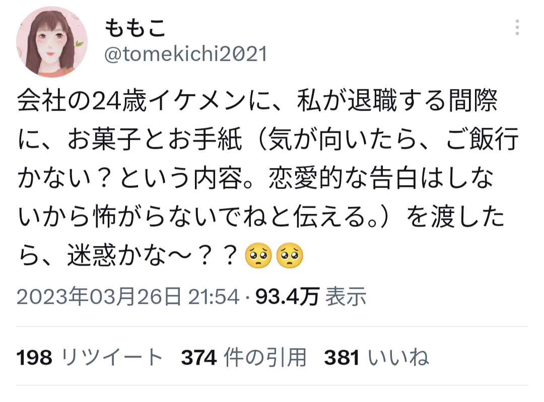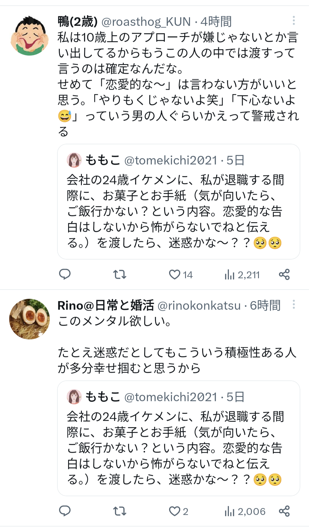 会社の24歳イケメンに、私が退職する間際に、お菓子とお手紙(気が向いたら、ご飯行かない?という内容。恋愛的な告白はしないから怖がらないでねと伝える。)を渡したら、迷惑かな〜??🥺🥺