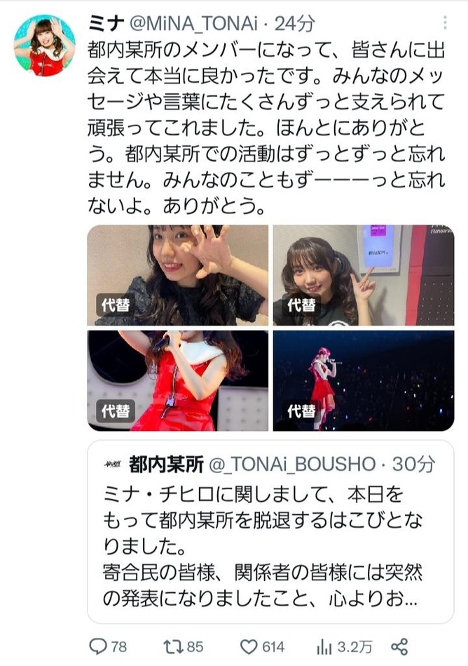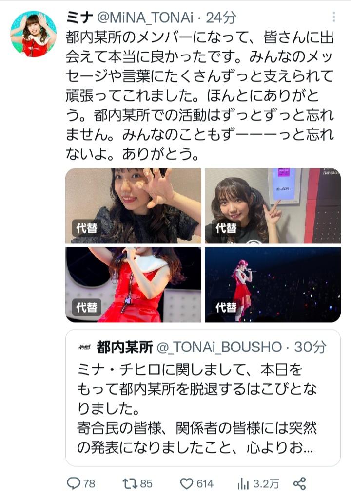 ミナ・チヒロに関しまして、本日をもって都内某所を脱退するはこびとなりました。