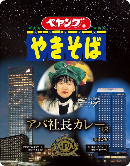 まるか食品と、アパホテルが展開するカレーブランド「アパ社長カレー」がコラボ。パッケージには、アパホテルの元谷芙美子社長と、アパホテル&リゾートをデザインしている。 pic.twitter.com/8qgNlQtiSF