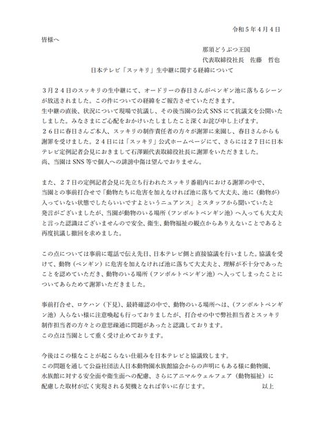 日本テレビ「スッキリ」生中継に関する経緯について 那須どうぶつ王国