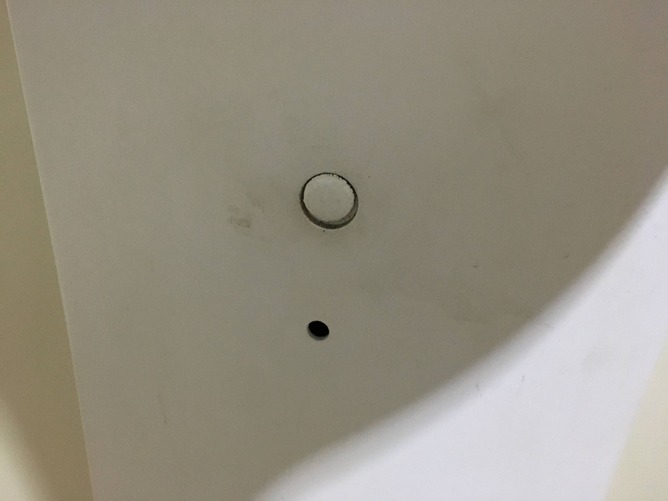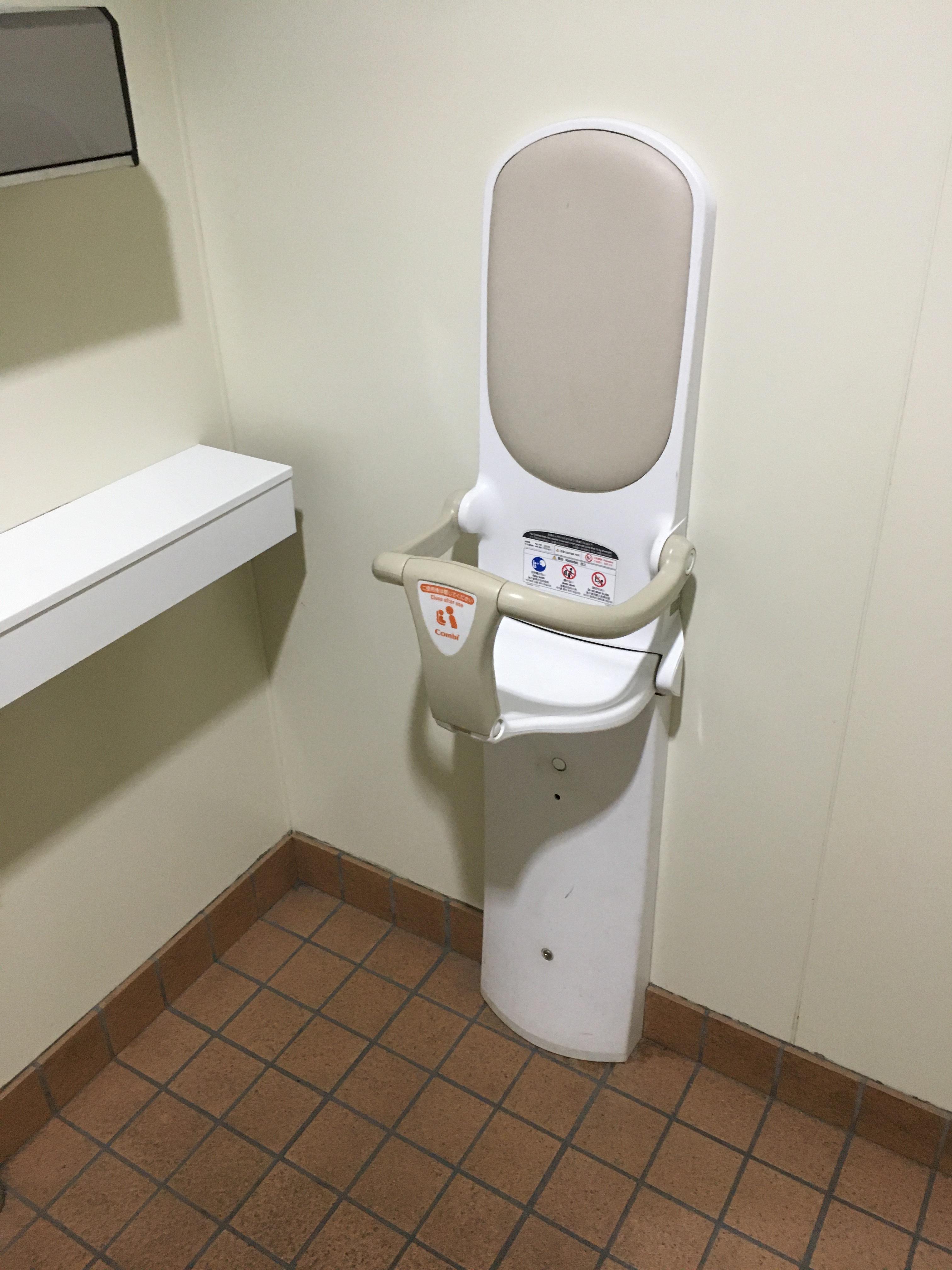 便器の正面に設置されたベビーチェアの台座をくり抜いて設置されていた模様