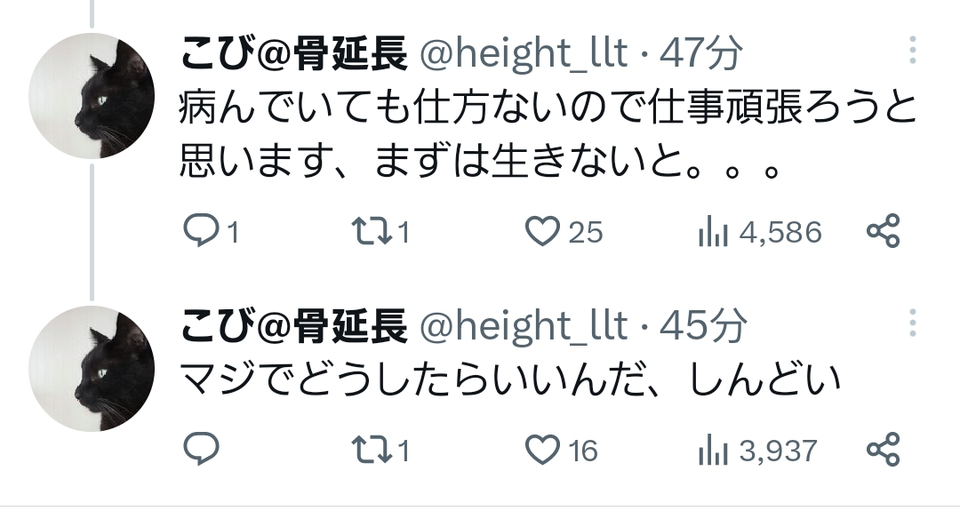いまだ治らず、いまだ歩けない状態と痛みが続いております。。最近はもうどうしたらいいのかと病んでいる— こび@骨延長 (@height_llt) May 1, 2023