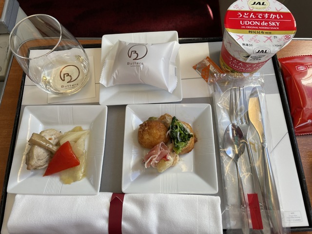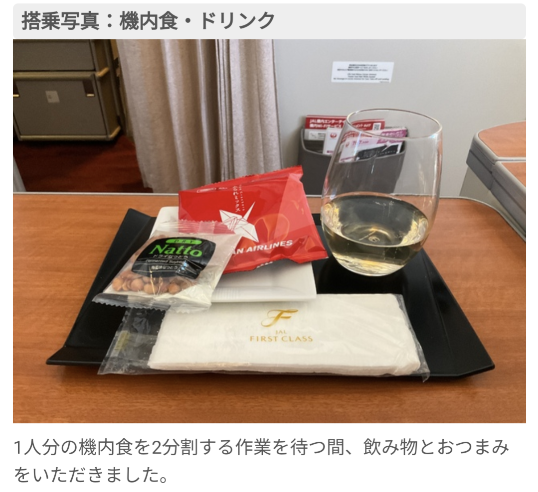 結果的に、JAJのファーストクラスの機内食1人分を2人分に分割し、うどんですかいを加えて食べるという、恐らく世界中で誰も経験したことのない貴重な体験をすることができ、一生忘れられない思い出になりました。