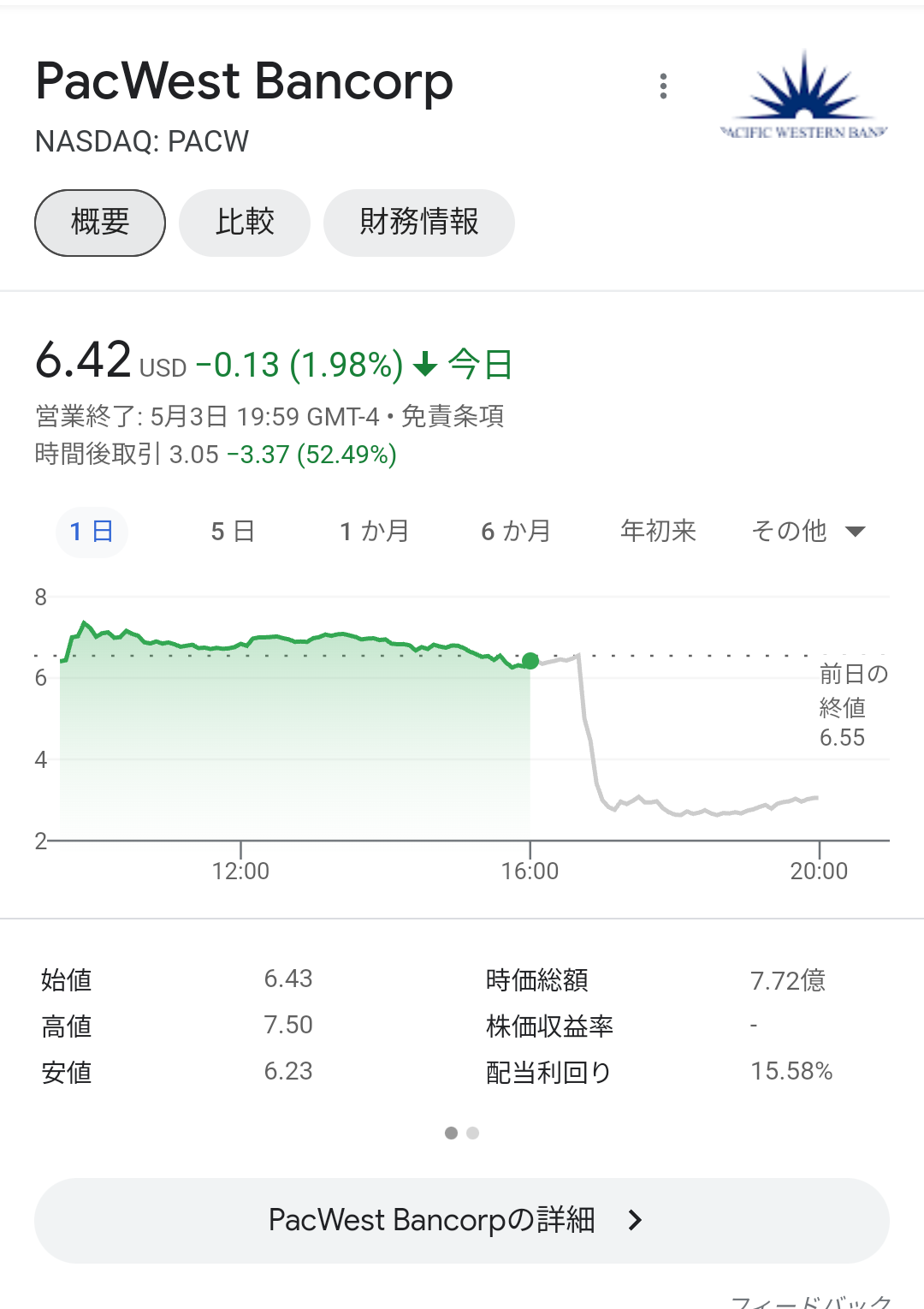 PACW(CAの地銀)「すまん、うちヤバいから身売りするわ…。」→PACWアフターで-52%の暴落ドーンッ!、ついでにWALも-23%ドーンッ!w