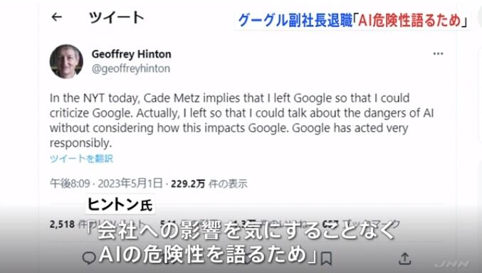 「AIの危険性を語るため」人工知能研究の第一人者ジェフリー・ヒントン氏がGoogle退社 https://t.co/bJXIVJO4oq