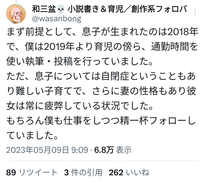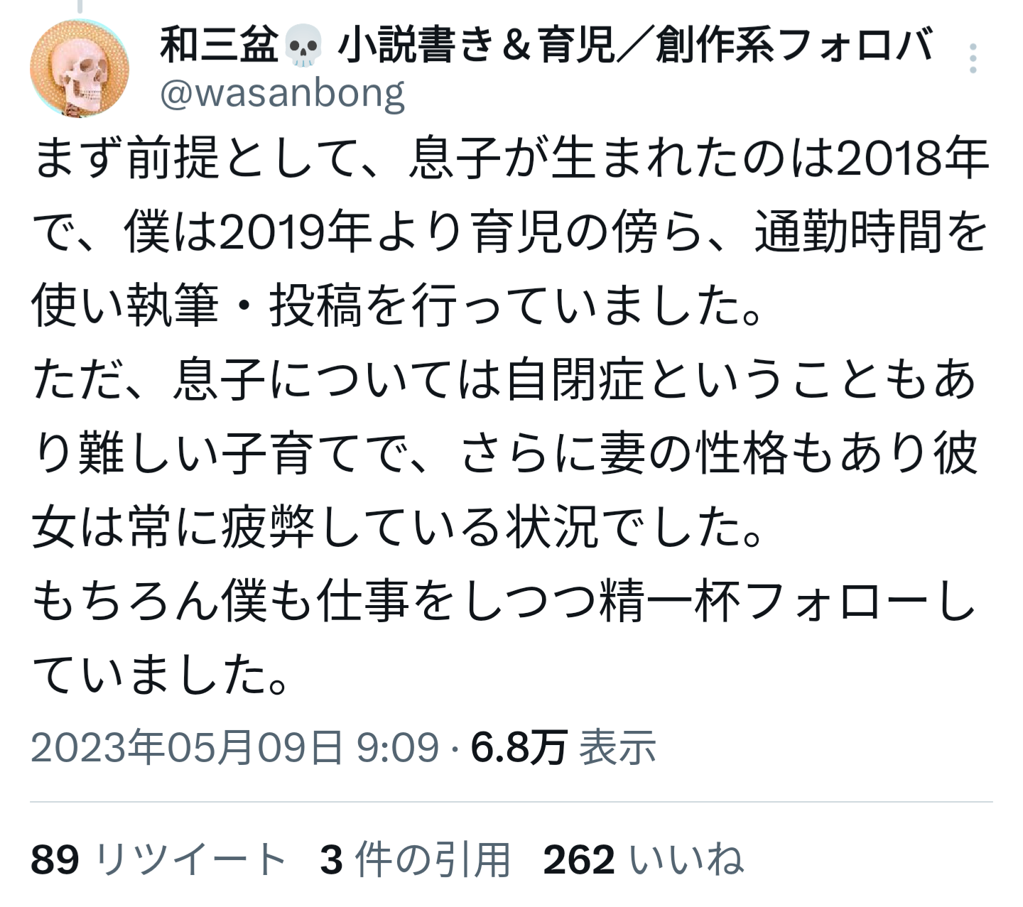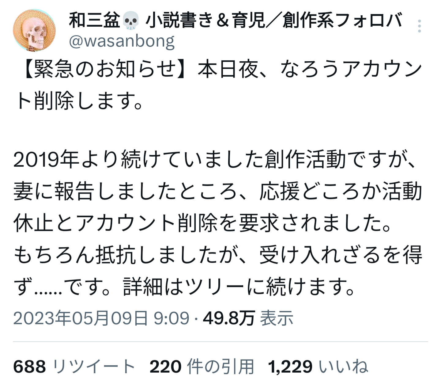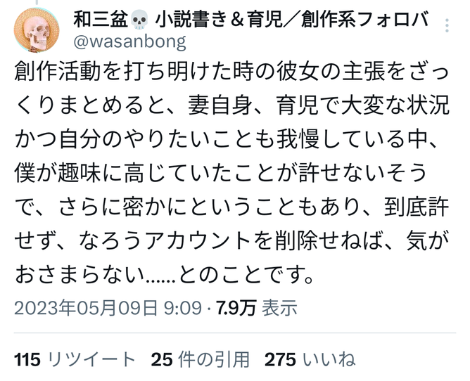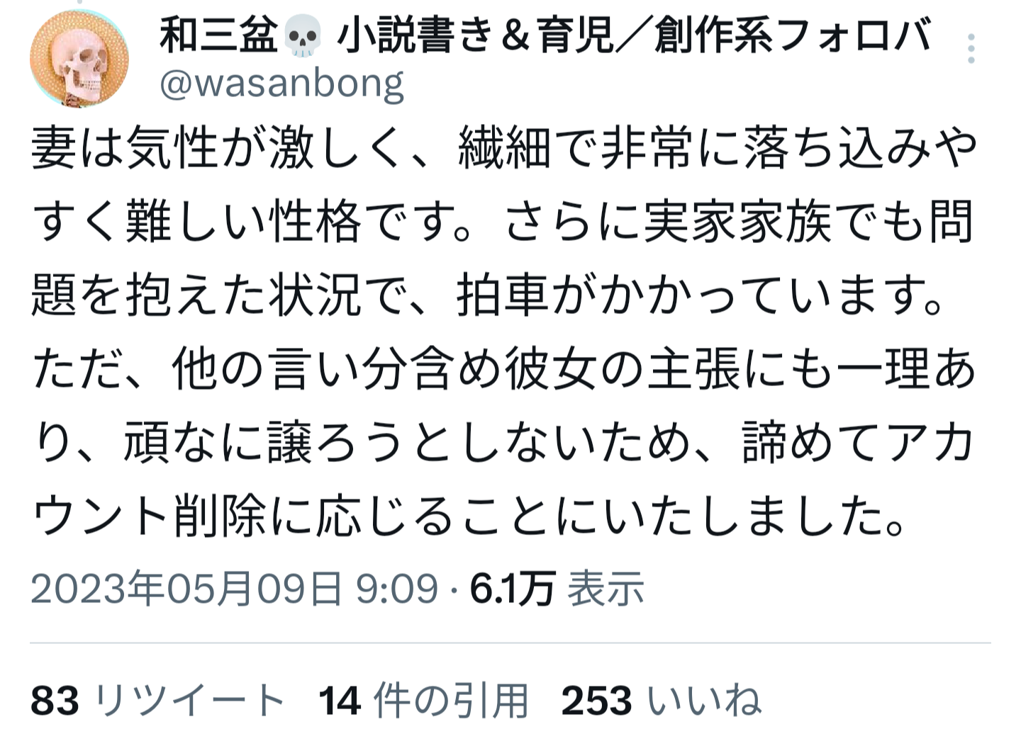 もちろん抵抗しましたが、受け入れざるを得ず……です。詳細はツリーに続けます。— 和三盆💀 小説書き&育児/創作系フォロバ (@wasanbong) May 9, 2023