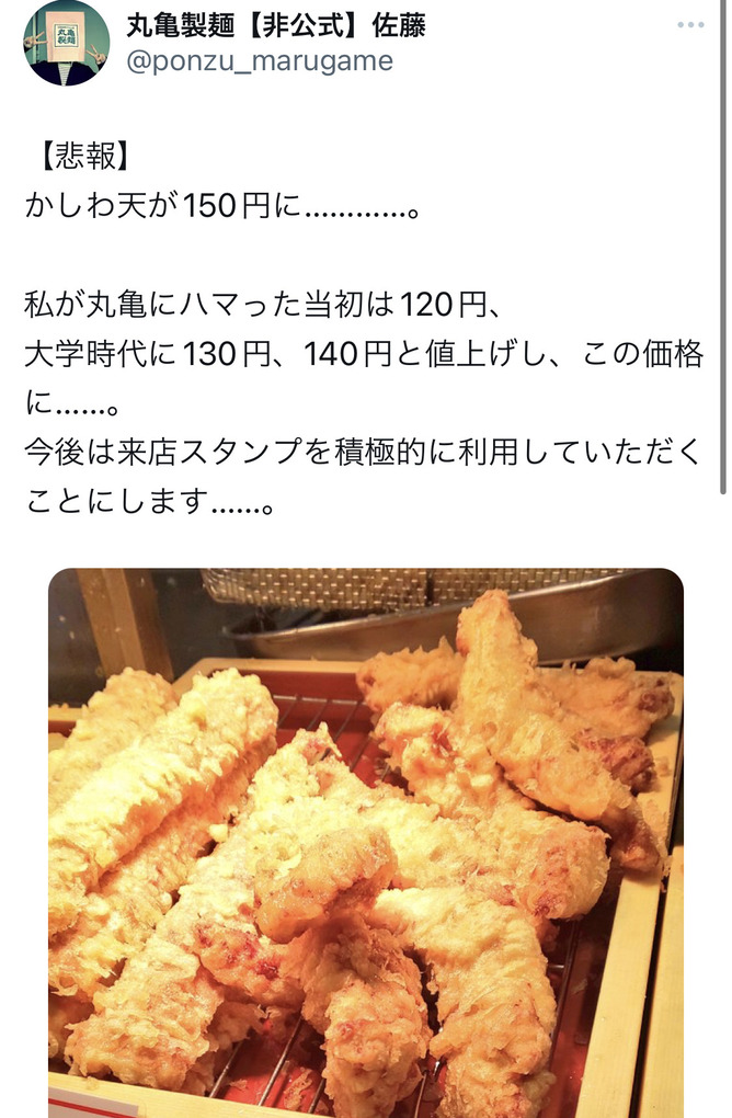 かしわ天が150円に…………。私が丸亀にハマった当初は120円、