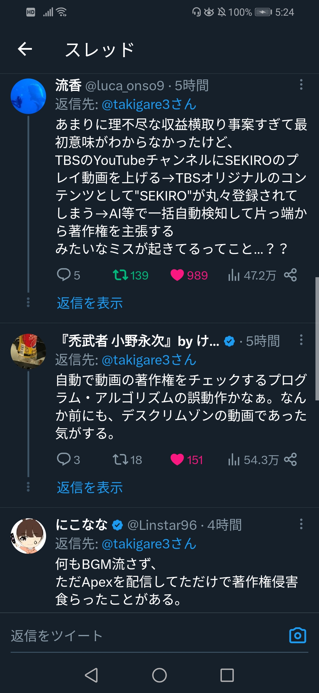 昔からSEKIRO動画をあげていたYouTube投稿者らの動画収益が根こそぎTBSに奪われる事態に