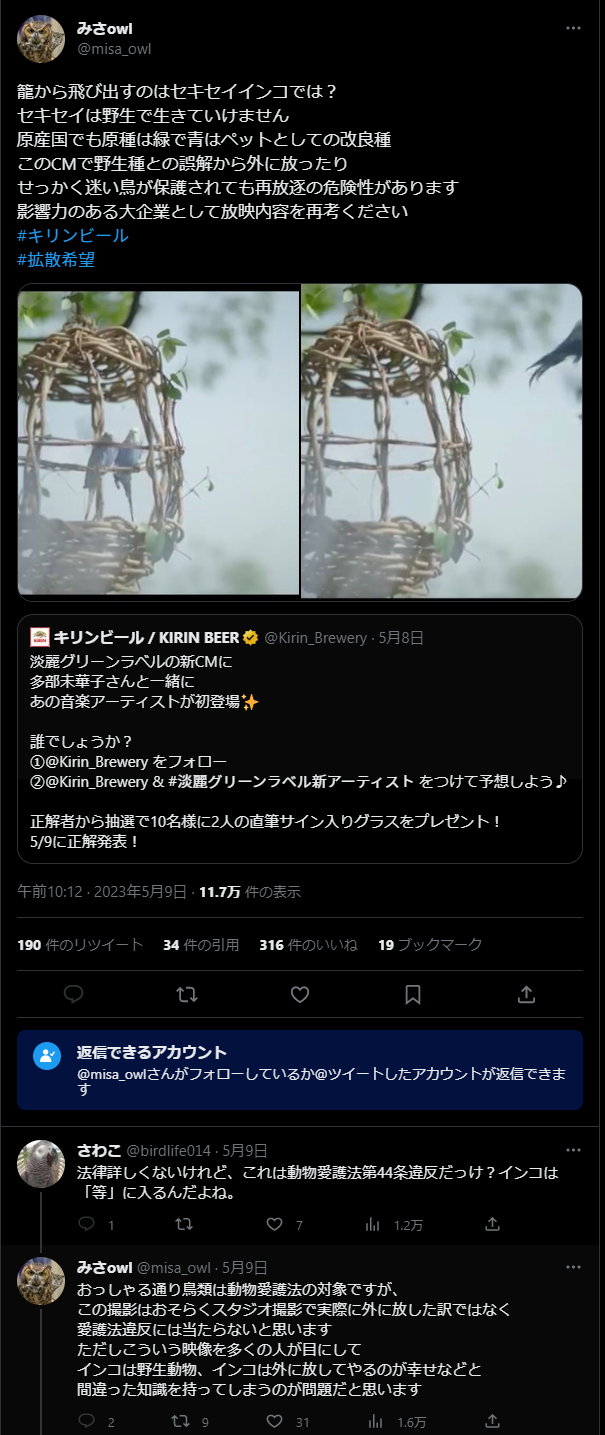 星野源が出演するキリンビールの淡麗グリーンラベルのCMについて、愛鳥家からの批判が相次ぎ、動画が削除されました。キリンビールはこの件について深くお詫び申し上げます。■批判内容… pic.twitter.com/QPP8lUSPi7