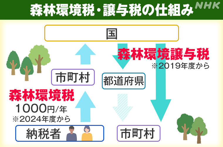 2024年度から日本に住所をおく人は1年間につき1人あたり1000円を森林環境税として納めることが義務となります。
