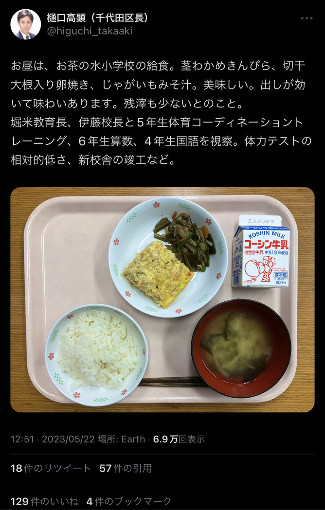 【画像】東京千代田区長、クソ不味そうな貧乏給食を何故かベタ褒めwwwwwwwww