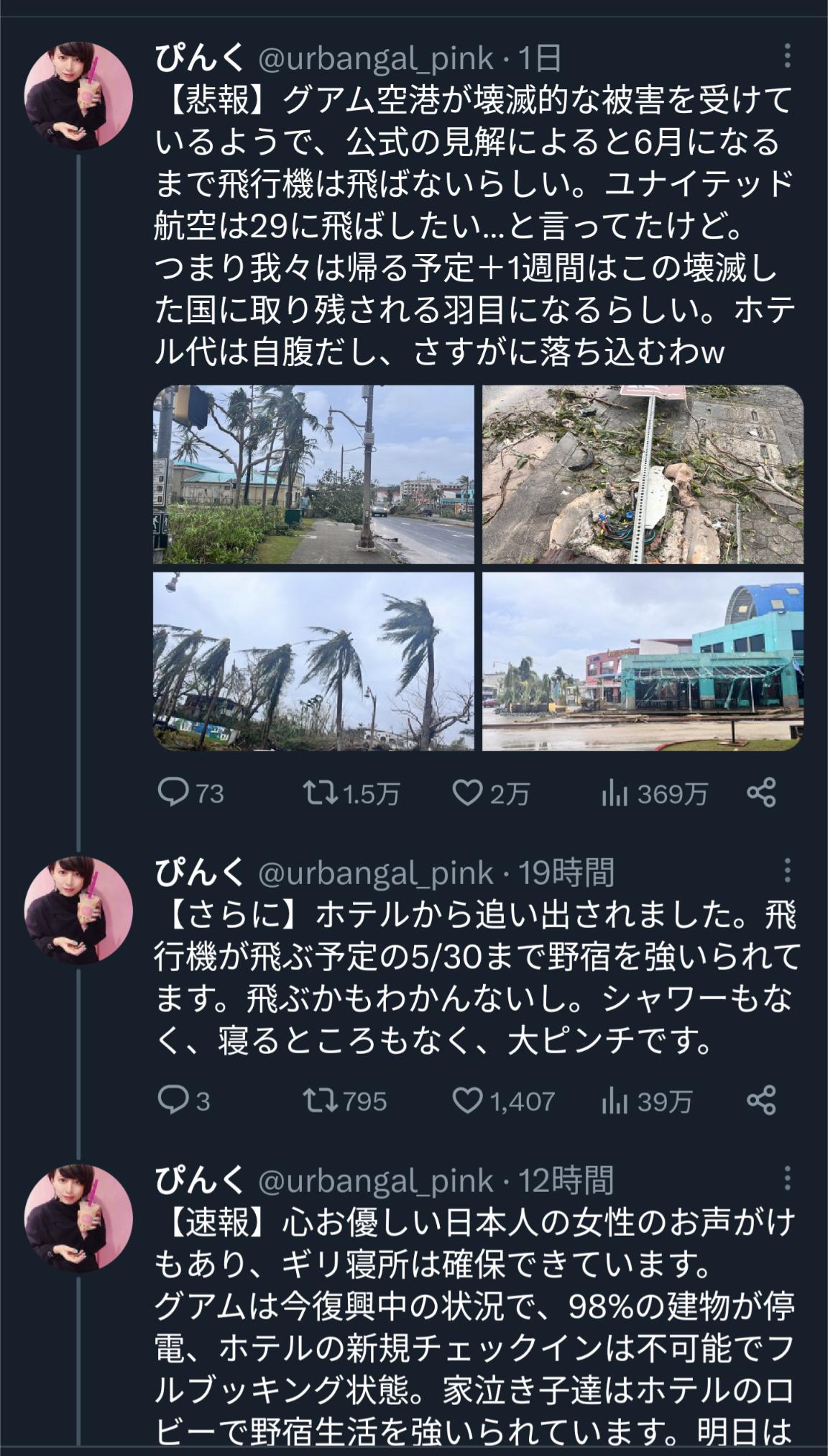 つまり我々は帰る予定+1週間はこの壊滅した国に取り残される羽目になるらしい。ホテル代は自腹だし、さすがに落ち込むわw pic.twitter.com/dQNe9fXEwD— ぴんく (@urbangal_pink) May 26, 2023