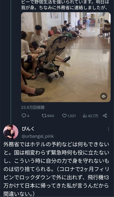 外務省ではホテルの予約などは何もできないと。国は相変わらず緊急時何も役に立たないし、こういう時に自分の力で身を守れないものは切り捨てられる。(コロナで2ヶ月フィリピンでロックダウンで外に出れず、飛行機13万かけて日本に帰ってきた私が言うんだから間違いない。)
