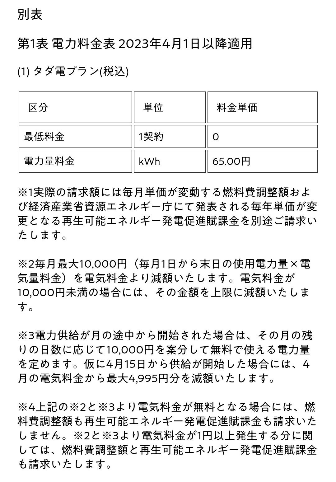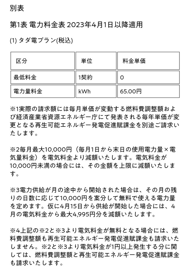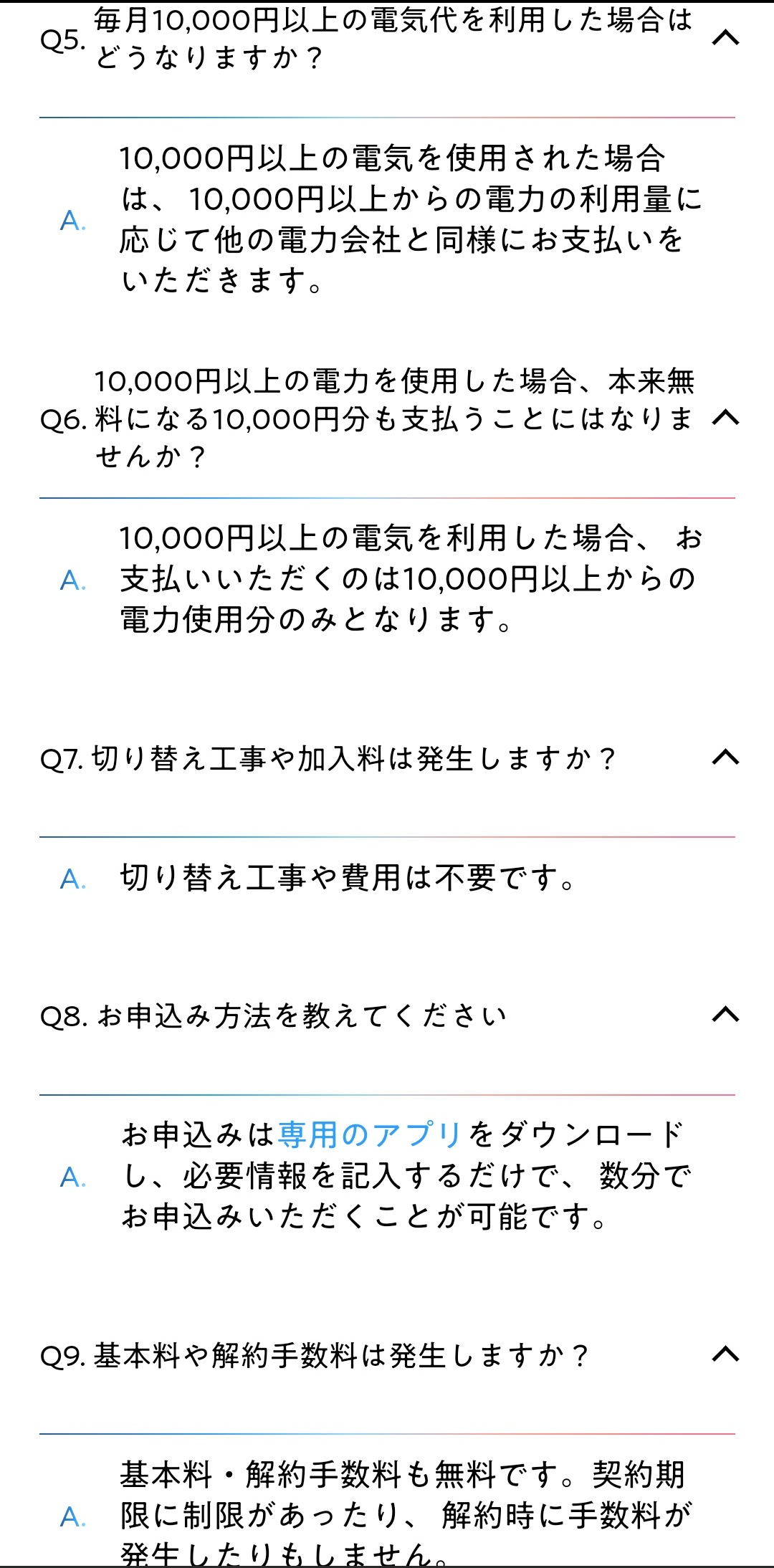 10,000円以降の電気の利用に関しては利用量に応じてお支払いをいただきますが、電気代が10,000円に満たない場合は、いっさい電気代をお支払いいただく必要はない電力会社となります。
