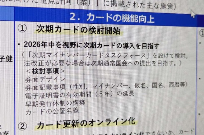 今回、公表されたのが「次期マイナンバーカード」についての検討だ。マイナンバーカードの発行開始(2016年1月)から10年を迎えるタイミングを目処に、現在指摘されている課題や新たな技術を盛り込みながら、2026年度中の導入を目指す。