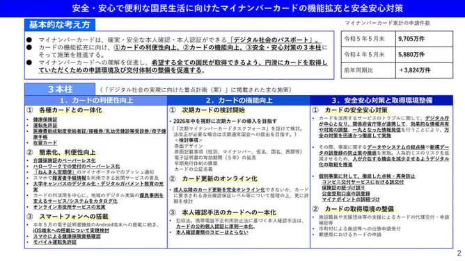 「デジタル社会のパスポート」と位置づけるマイナンバーカードについては、「利便性向上」「機能向上」「安全安心対策」の3本柱で推進する。
