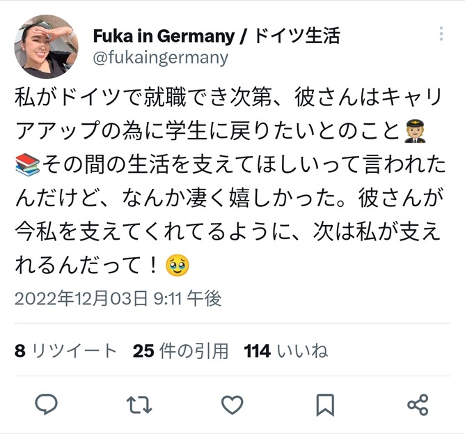 私がドイツで就職でき次第、彼さんはキャリアアップの為に学生に戻りたいとのこと🧑🏼✈️📚その間の生活を支えてほしいって言われたんだけど、なんか凄く嬉しかった。彼さんが今私を支えてくれてるように、次は私が支えれるんだって!🥹