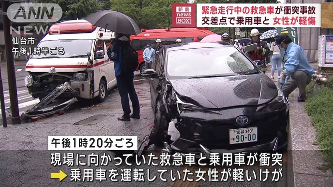 警察と消防によりますと、16日午後1時20分ごろ、仙台市内の交差点で現場に向かっていた救急車と乗用車が衝突しました。
