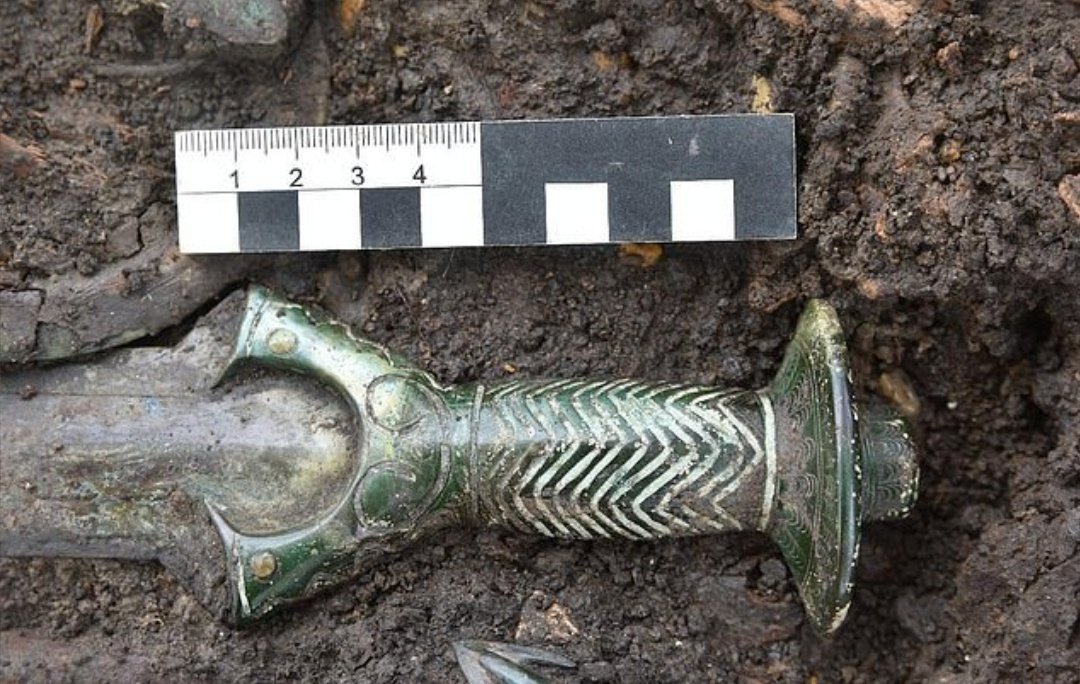 (CNN) ドイツ南部バイエルン州の埋葬地で、考古学者が八角形の柄(つか)を持つ3000年以上前の剣を発見した。
