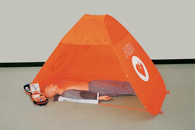 救命テントのメリットは一体なにか。同社は(1)AED使用時の傷病者のプライバシーを守る(2)救助者の周囲の影響に作用されずに、自信をもってAEDを使用したり、学習した救命手順を落ち着いて実施できるようサポートする(3)「AED」と「救命中」のロゴで遠くからでも救命中であることが分かる――の3点を挙げた。