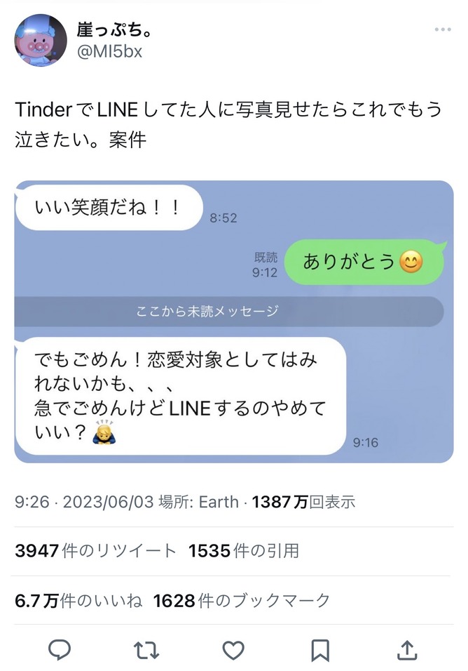 TinderでLINEしてた人に写真見せたらこれでもう泣きたい。案件 pic.twitter.com/6gOzldZrXv