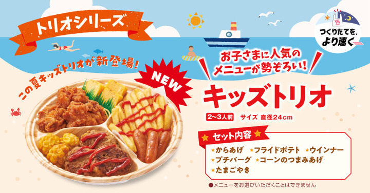 唐揚、フライドポテト、ウインナー、プチバーグ、コーンのつまみあげ、玉子焼きなど大好きなおかずをぎゅっと詰め込んだ! ほっかほっか亭が「キッズトリオ」を発売