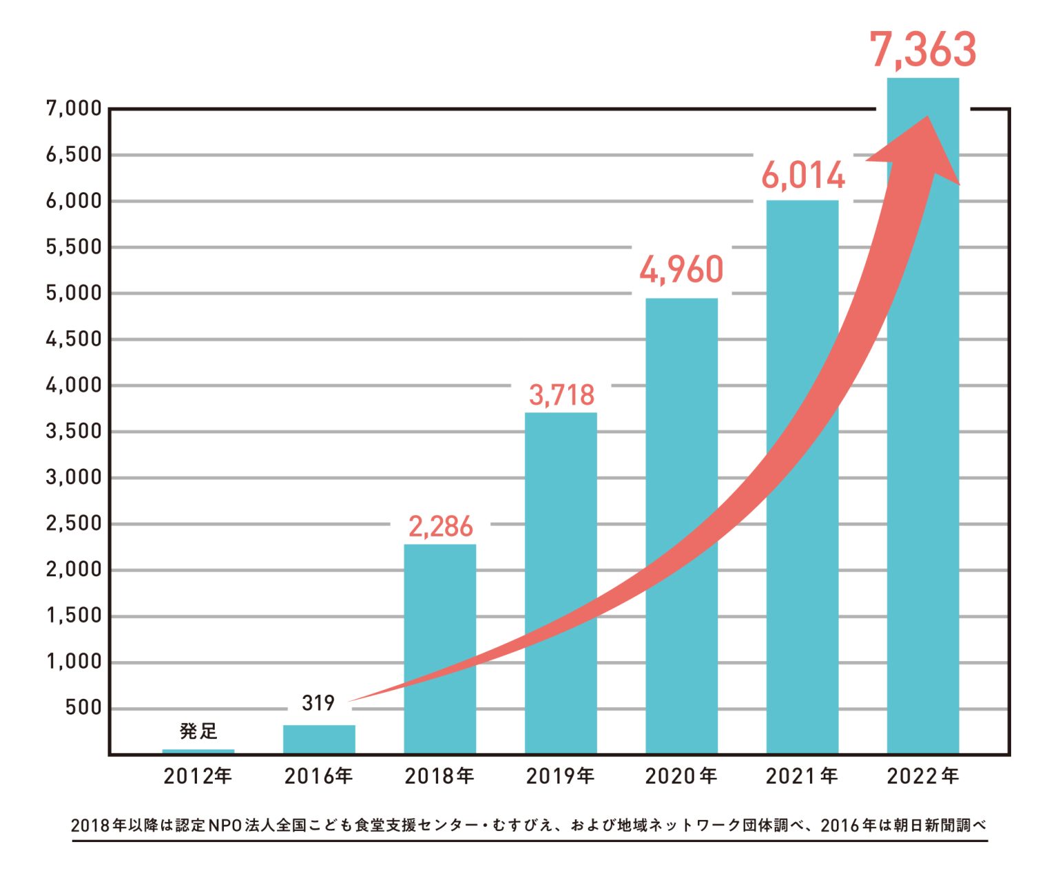 認定NPO法人全国こども食堂支援センター・むすびえ(以下、むすびえ)」(東京都新宿区、理事長:湯浅誠)は、全国のこども食堂地域ネットワーク団体等の協力を得て実施した2022年度のこども食堂全国箇所数調査について、2022年12月15日、「速報値」として7,331箇所と発表しましたが、このたび最新の調査結果として「確定値」をまとめました。確定値は7,363箇所となり、2021年度から1,349箇所増加しました。コロナ禍以降(2020年2月以降)において、最も多い増加数になります。