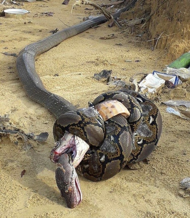ニシキヘビはキングコブラを窒息させ、キングコブラはそれを噛みました。ヘビは2匹とも死亡し、1匹は窒息、もう1匹は毒により死亡した。