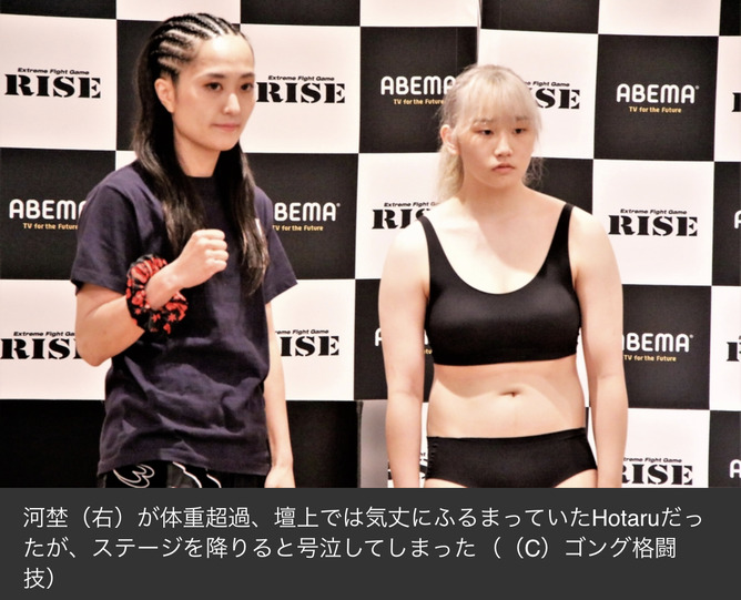 オープニングファイト第1試合フライ級(-53kg)3分3Rで対戦する、Hotaru(Continue)は52.80kgで計量をパスしたが、河埜留奈(TEAM TEPPEN)は56.70kgでなんと3.7kgオーバー。