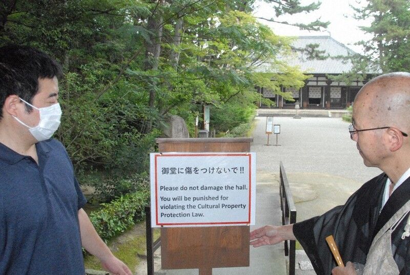 唐招提寺は世界遺産で、金堂は奈良時代の創建時の姿を伝える。最近はインバウンド(訪日外国人)も増え、設置した看板は日本語と英語で記した。