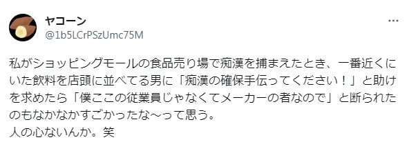 私がショッピングモールの食品売り場で痴漢を捕まえたとき、一番近くにいた飲料を店頭に並べてる男に「痴漢の確保手伝ってください!」と助けを求めたら「僕ここの従業員じゃなくてメーカーの者なので」と断られたのもなかなかすごかったな〜って思う。