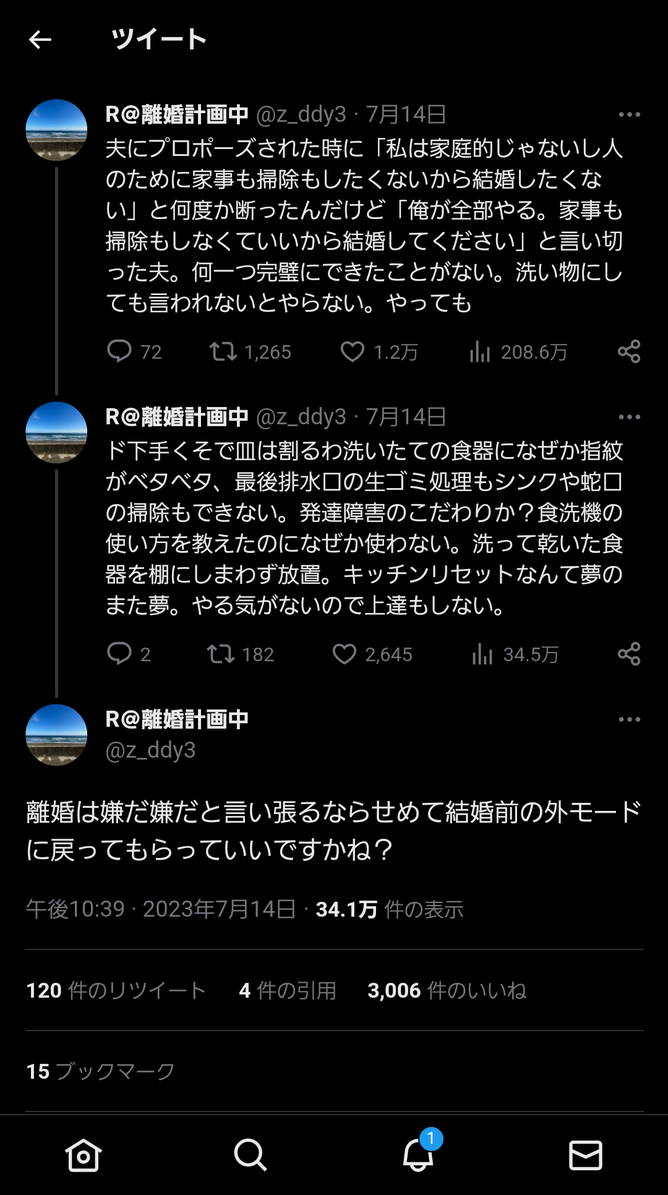 夫にプロポーズされた時に「私は家庭的じゃないし人のために家事も掃除もしたくないから結婚したくない」と何度か断ったんだけど「俺が全部やる。家事も掃除もしなくていいから結婚してください」と言い切った夫。何一つ完璧にできたことがない。洗い物にしても言われないとやらない。やっても