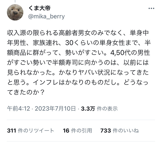 収入源の限られる高齢者男女のみでなく、単身中年男性、家族連れ、30くらいの単身女性まで、半額商品に群がって、勢いがすごい。4,50代の男性がすごい勢いで半額寿司に向かうのは、以前には見られなかった。かなりヤバい状況になってきたと思う。インフレはかなりのものだし。どうなってきたのか?