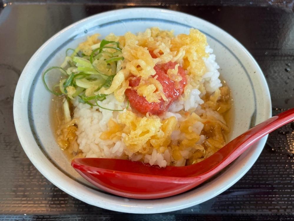 (1)白ごはん(140円)と明太子(90円)、だし(0円)を注文し、無料の天かすと青ねぎをお好みの量で用意します。