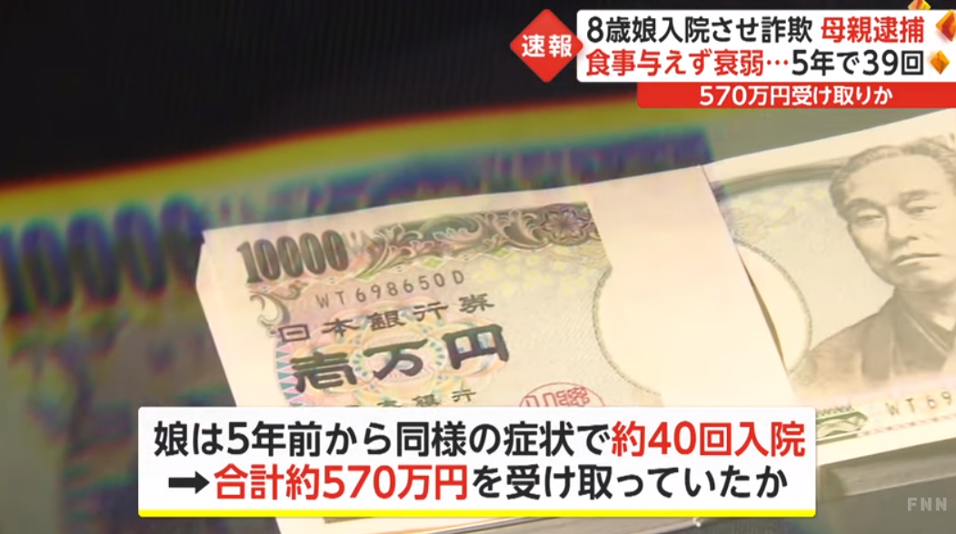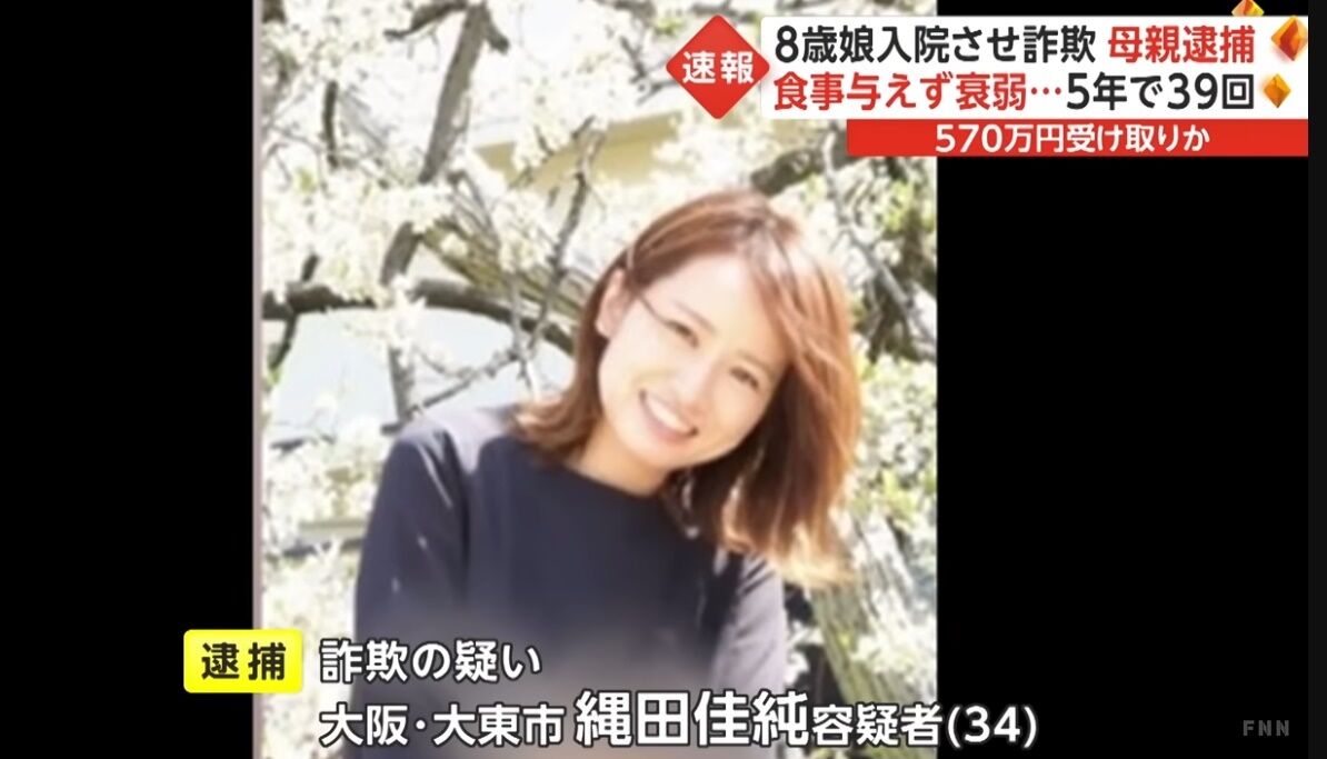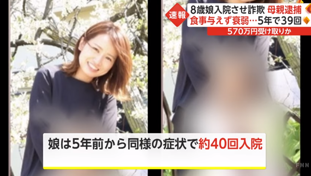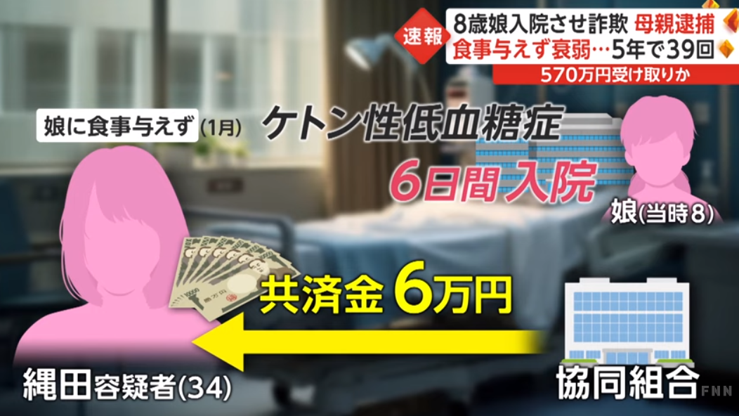 縄田容疑者は2023年1月、当時8歳だった娘に食事を与えず、おう吐や脱水等を伴う「ケトン性低血糖症」で6日間入院させ、入院時に支払われる共済金6万円をだまし取った疑いが持たれている。