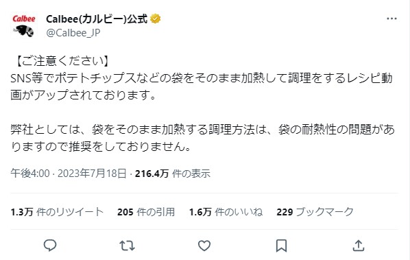 【緊急】カルビー「SNSでポテトチップス袋ごと茹でる調理がバズってますが、絶対にやめて下さい」