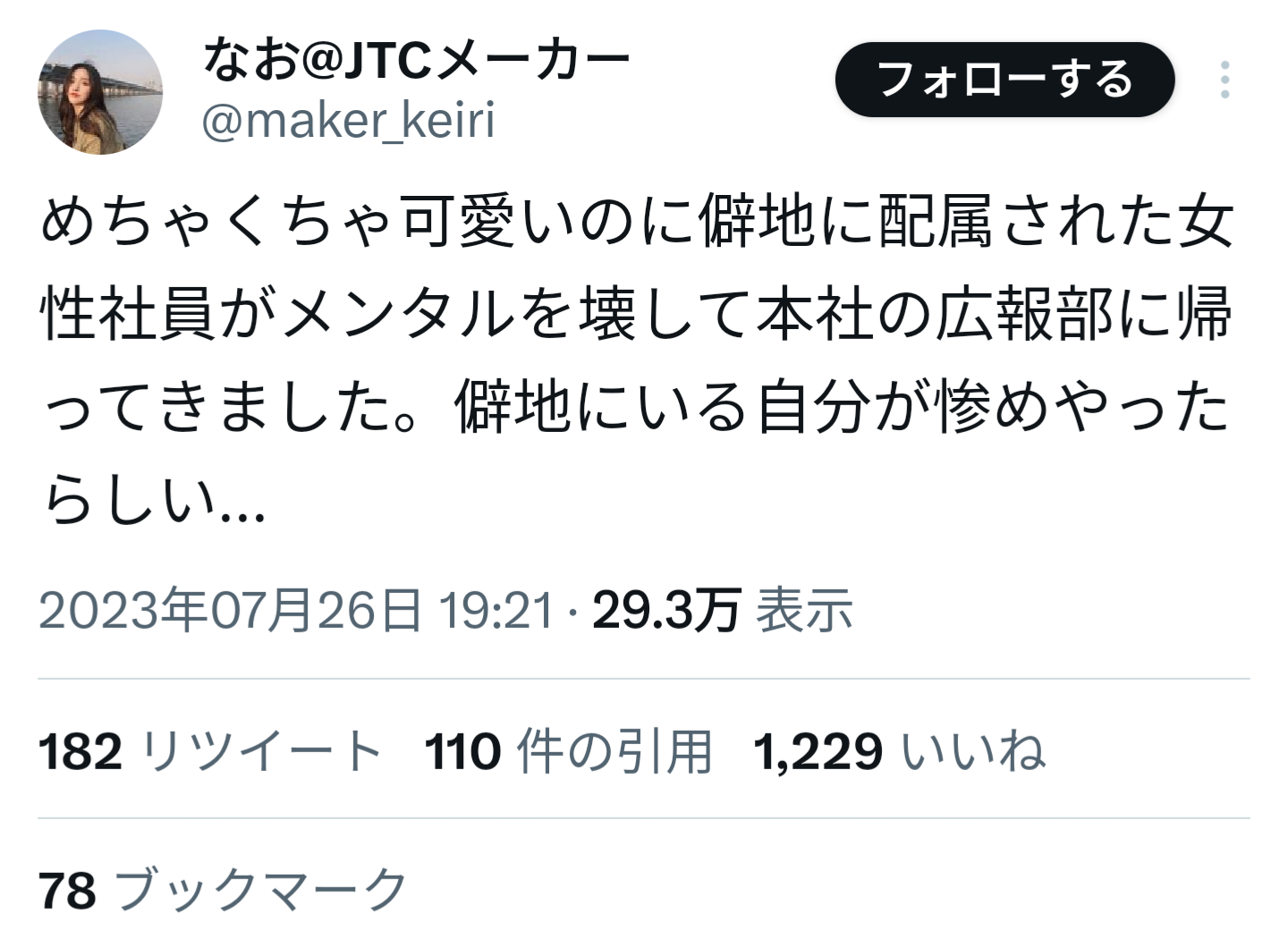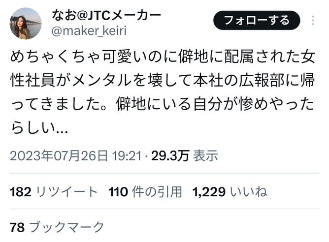 めちゃくちゃ可愛いのに僻地に配属された女性社員がメンタルを壊して本社の広報部に帰ってきました。僻地にいる自分が惨めやったらしい…