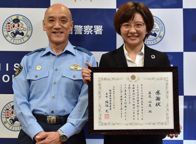 JR筑肥線の列車内で女性を盗撮していた男を取り押さえ駅員に引き渡した20歳の女性教師に警察から感謝状が贈られました。