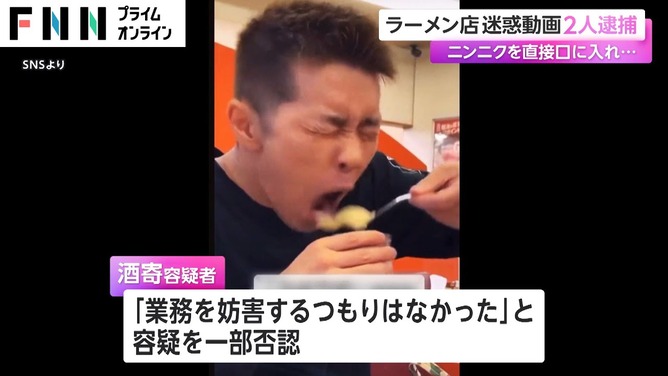 迷惑行為が撮影されたのは、栃木・宇都宮市にあるラーメン店。おろしニンニクの入った容器についている共用のスプーンを口に入れたあと、再び容器に戻す迷惑行為を動画で撮影し、その動画をSNSに投稿して拡散させたという。https://news.yahoo.co.jp/articles/0584cdb2b47b23b6314c524920420bcba8f784c1