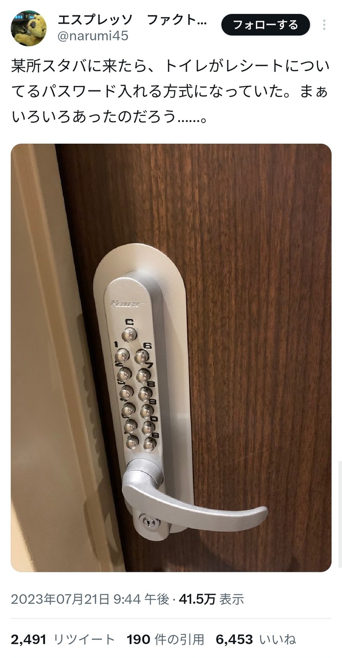 某所スタバに来たら、トイレがレシートについてるパスワード入れる方式になっていた。まぁいろいろあったのだろう……。 pic.twitter.com/t7KLIT8Uyt