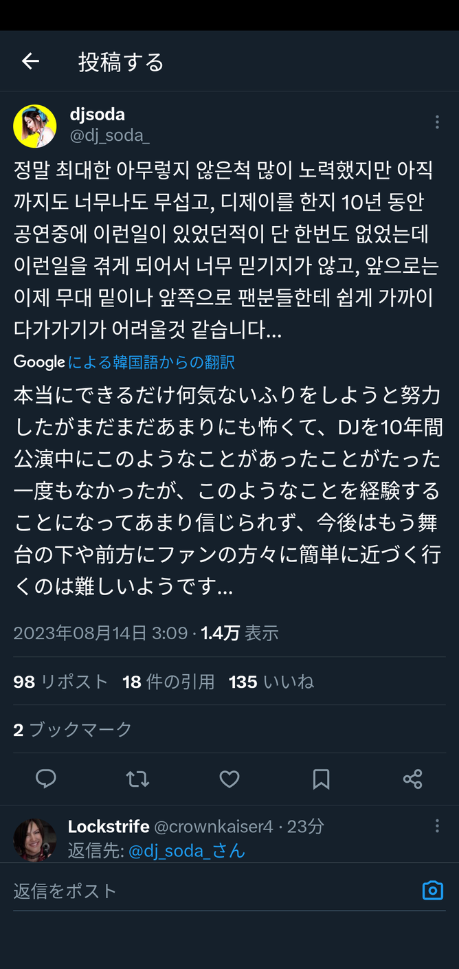 오늘 일본 오사카 뮤직 써커스 페스티벌에서 공연을 했는데 한명도 아니고 여러명이 갑자기 저의 가슴을 만지면서 속수무책으로 성추행을 당했습니다…너무 놀라고 무서웠지만, 저를 보고 너무 좋아해주며 울기도 하는 팬분들도 계셔서 일단 끝까지 마치려고 pic.twitter.com/aUqUqLfRne