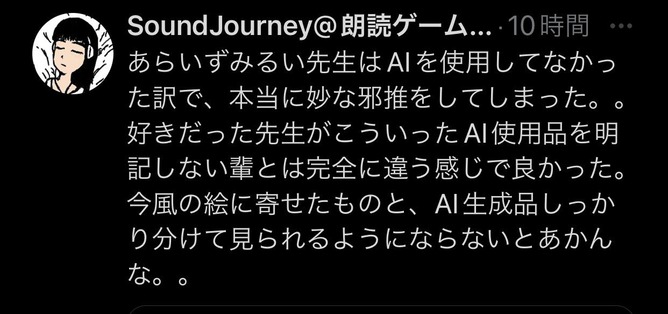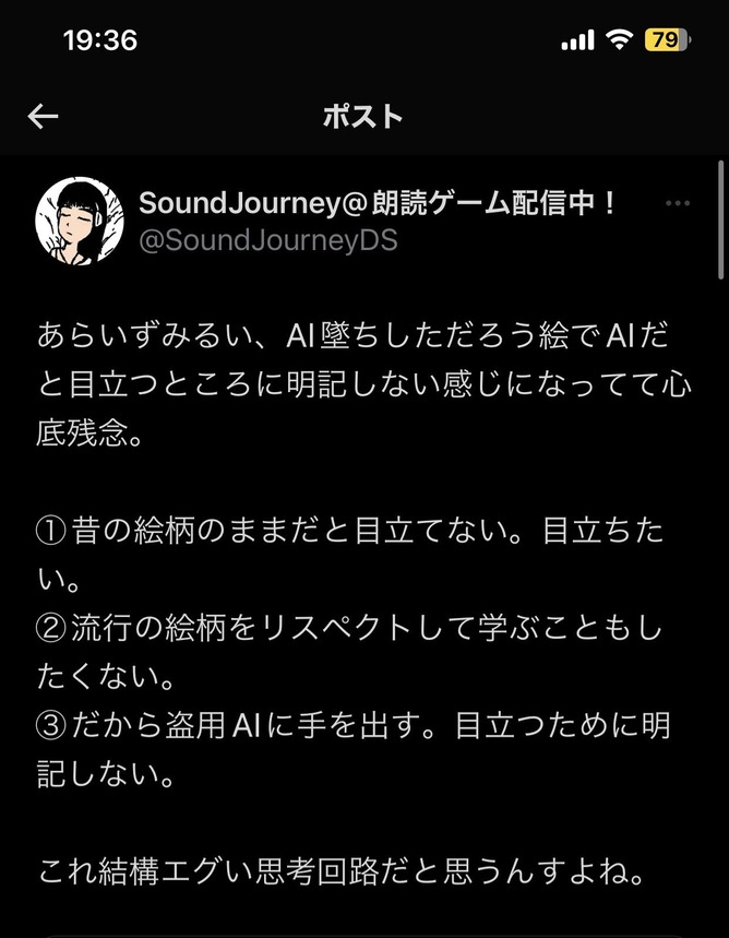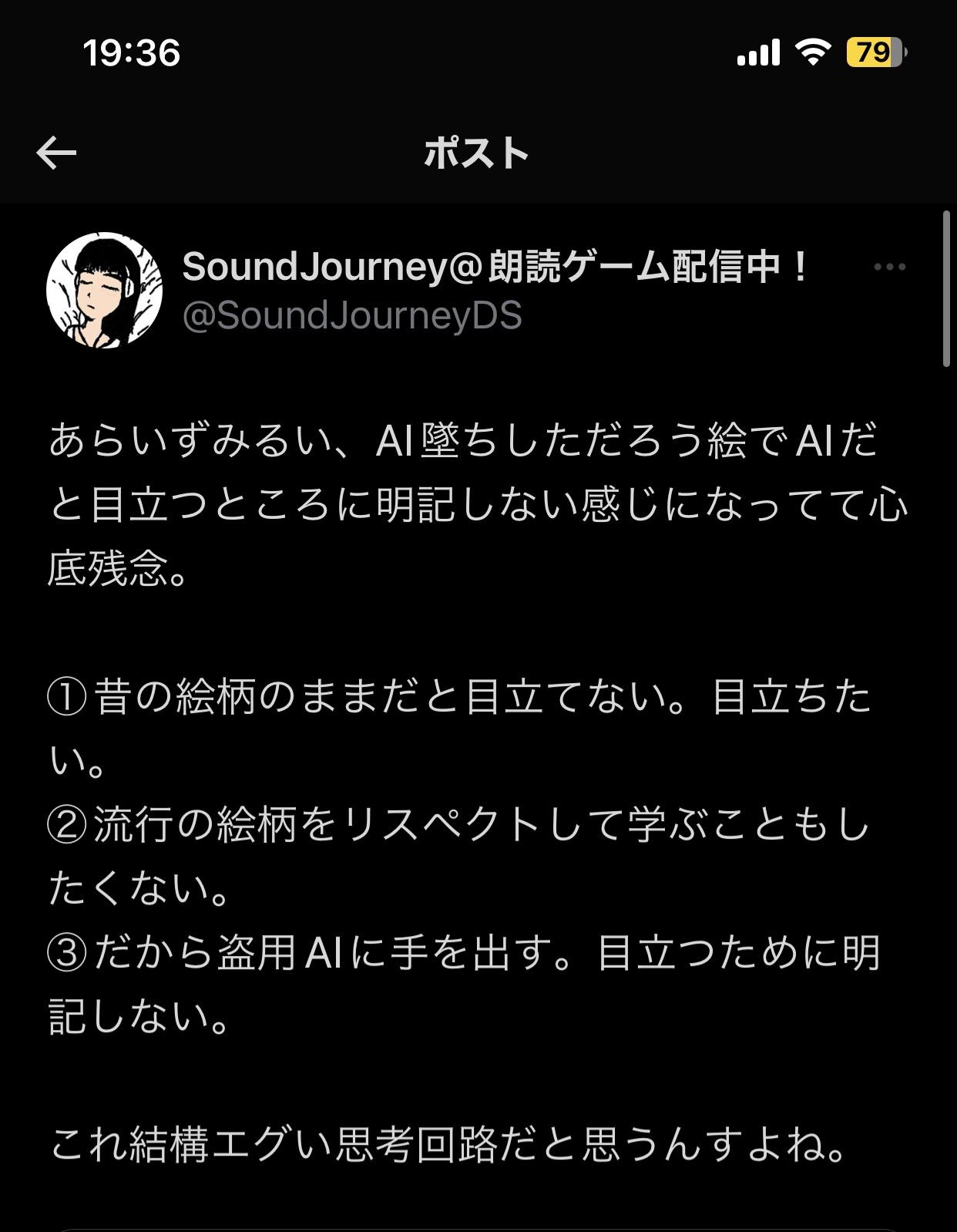 ③だから盗用AIに手を出す。目立つために明記しない。これ結構エグい思考回路だと思うんすよね。 https://t.co/pbzZP1fTpX