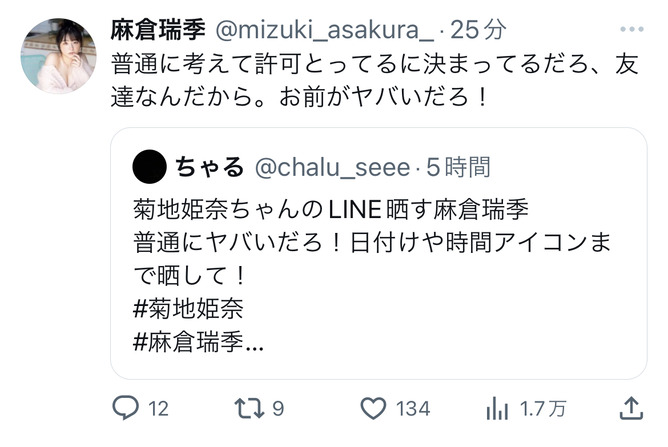 【悲報】菊地姫奈ちゃん、とうとうガチのLINE流出wwwwwww
